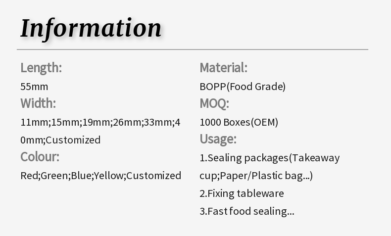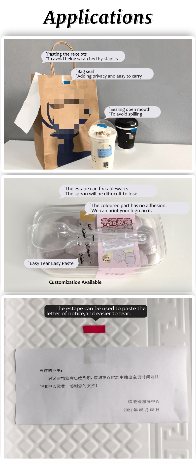 نوع من الشريط اللاصق سهل التمزق واللصق من جانب واحد ، وهو مصنوع من مادة OPP / PE ، كل قطعة من الشريط لها جزأين: الجزء اللاصق والجزء غير اللاصق ، إنه متعدد الاستخدامات للغاية ، يمكنك بسهولة إغلاق عبوات الطعام مثل الحليب - أكواب الشاي أو أكواب القهوة أو أكياس الخبز ، ووضع العلامات أو الملاحظات اللاصقة ... لإغلاق عبوات الطعام ، فإنه يمنع تسريب الطعام في الخارج ويحسن حفظ الطعام. من الالتصاق على الكتب ، ستجد الصفحة بسهولة. علاوة على ذلك ، أنت يمكنك أيضًا كتابة المذكرات عليها ، كما نوفر قاعدة الشريط ، حتى تتمكن من تمزيق الشريط بسهولة أكبر.